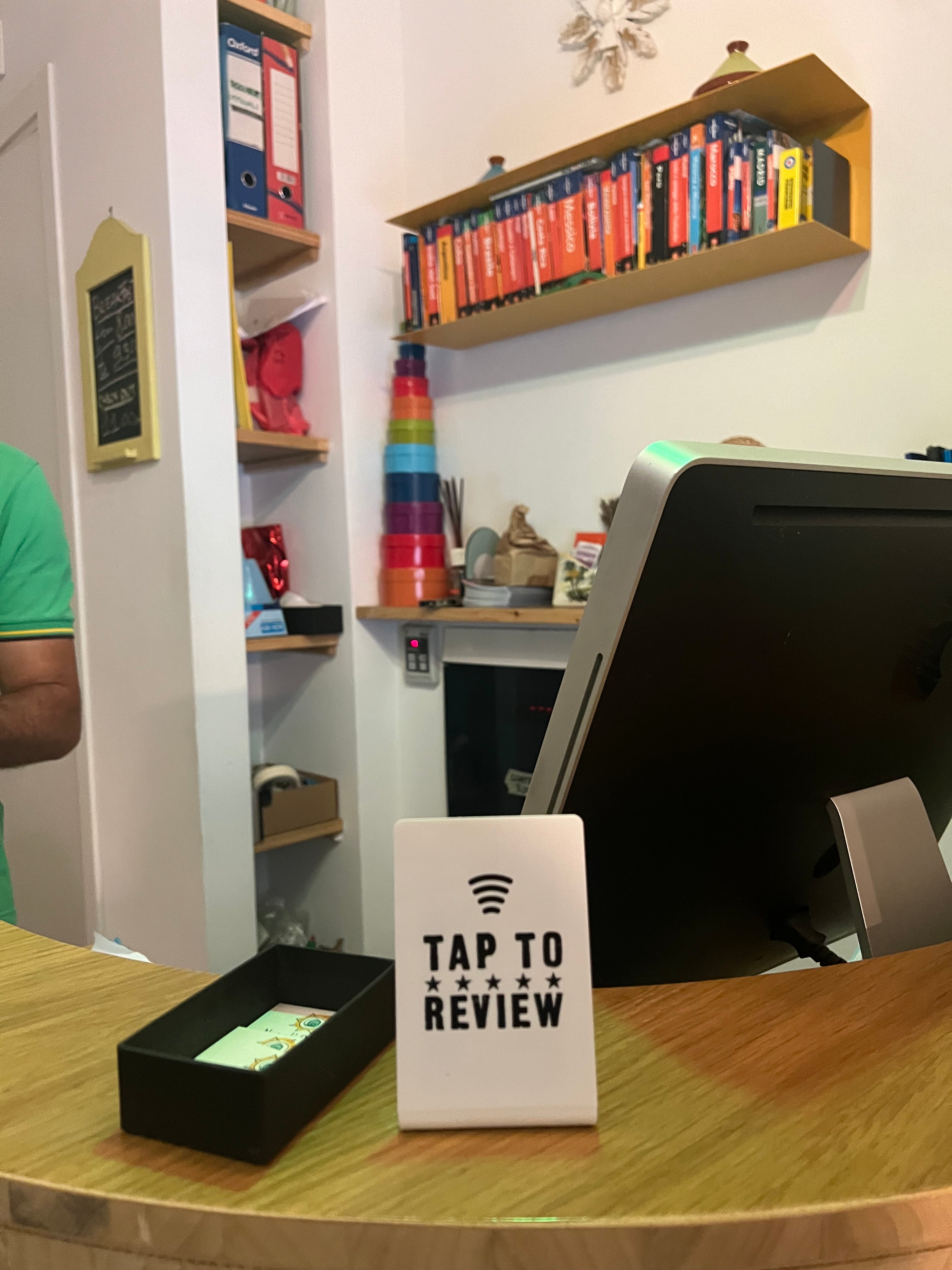 Display the card where your customers naturally pause, your payment counter, or handover point. With one tap, they’re taken straight to your Google review page. It’s the most effortless way to turn real-world interactions into online reputation, building social proof, improving visibility, and growing your business one tap at a time, in seconds!
